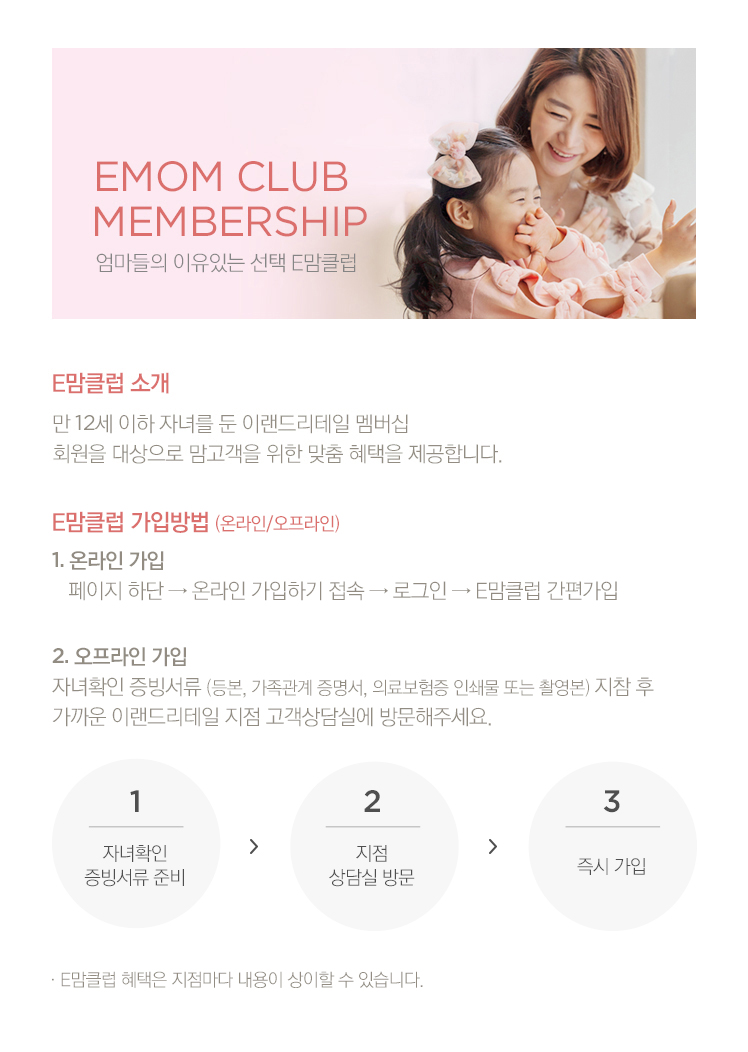 ※ E맘클럽 온라인 가입은 이랜드리테일 모바입 웹에서만 가입이 가능합니다.