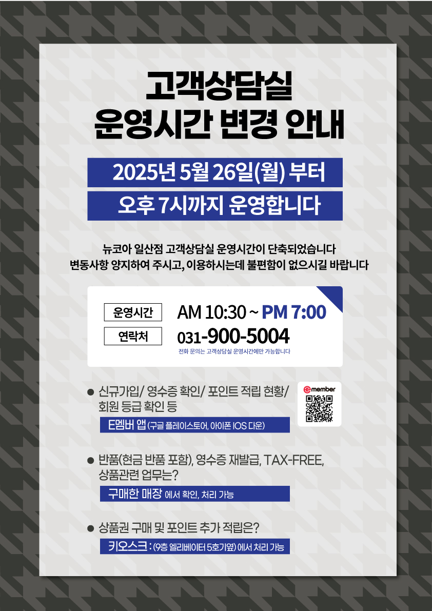 9층 뉴코아 일산점 고객상담실 운영 시간이 2025년 5월 26일(월) 부터 오후 7시까지 단축 운영합니다